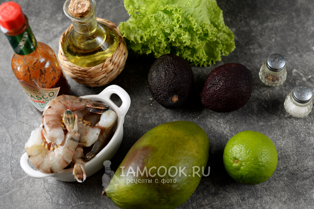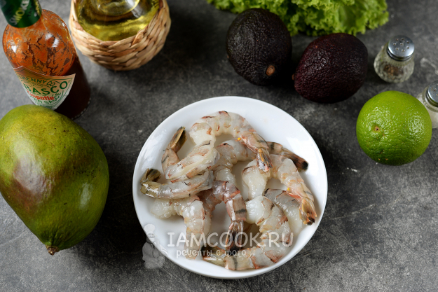 Подготовьте необходимые продукты для салата с манго, креветками и авокадо. Креветок предварительно разморозьте, листья салата помойте и обсушите.