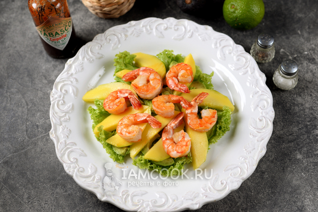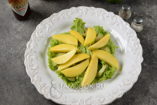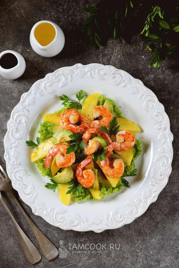 Украсить салат с манго и креветками можно листиками петрушки или кинзы. Приятного.