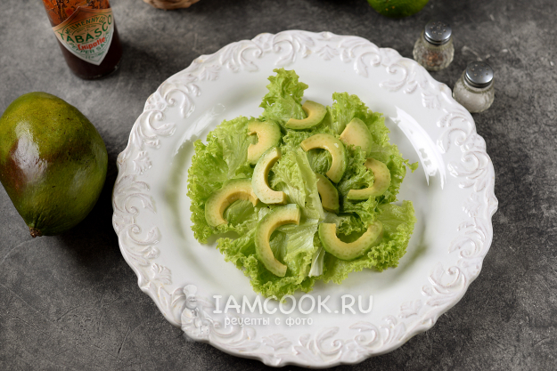 На большое блюдо выложите латук, который нужно порвать руками на небольшие кусочки. Сверху положите ломтики авокадо.