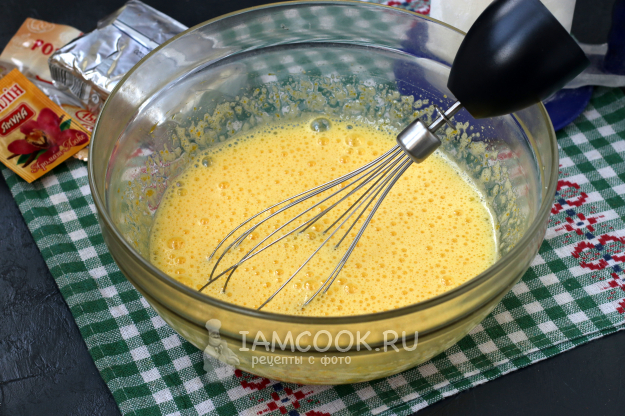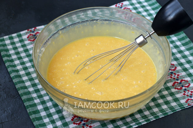Затем продолжить взбивать венчиком до однородной смеси. Тесто будет жидким, как для бисквита.