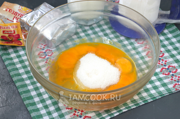 В миску разбить яйца, добавить сахар и ванилин.