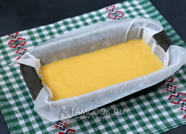 Форму 10x20 см застелить пергаментом и влить тесто.