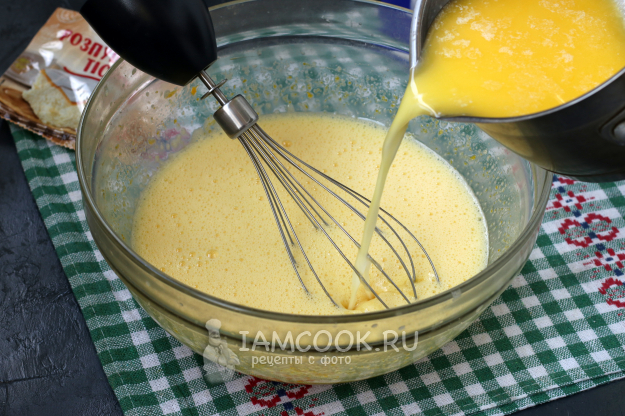 Горячее молоко с маслом струйкой вливать в яичную смесь, продолжая взбивать венчиком.