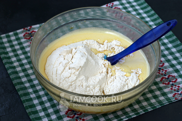 Далее в эту смесь добавить просеянную вместе с разрыхлителем муку. Сначала смесь перемешать лопаткой, чтобы не осталось сухих участков.
