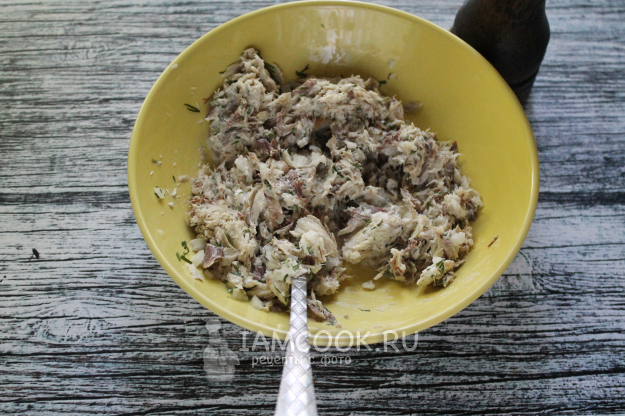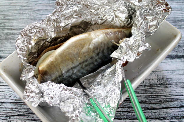 Запекшуюся скумбрию выньте их духовки, осторожно, чтобы не обжечься, разверните фольгу, лучше для этого использовать щипцы. Дайте рыбе слегка остыть, а потом отделите мякоть от косточек и вилкой разделите на волокна, как мы это делали в процессе приготовления рийета из свинины.
