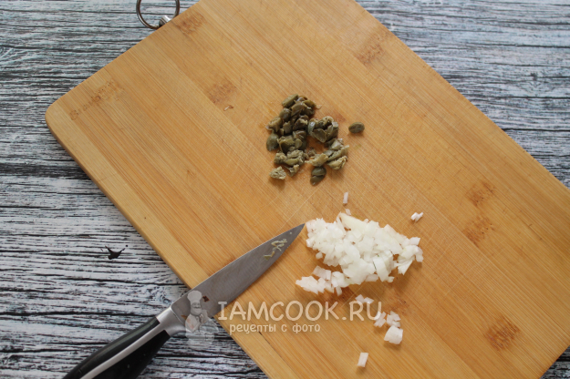 Тем временем, пока рыба в духовке, острым ножом очень мелко нарубите лук и каперсы.