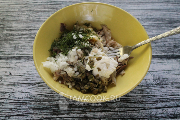 Добавьте к рыбе приготовленные компоненты заправки: лук, каперсы, мягкое сливочное масло, сыр каймак и укроп.