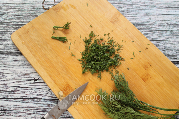 Укроп промойте и обсушите, отрежьте у веточек зелени только тонкие листочки и мелко их нарежьте.