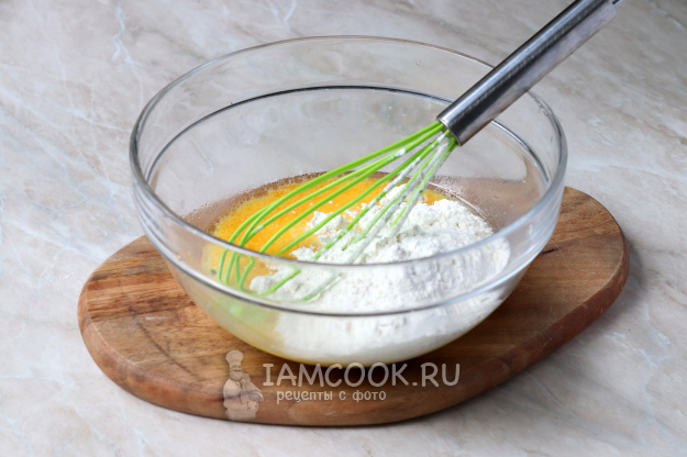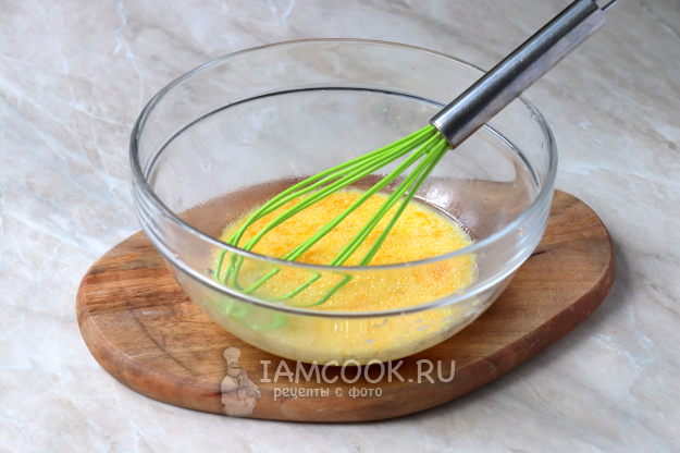 В глубокой миске соедините молоко, куриное яйцо, соль и растительное масло. С помощью венчика тщательно перемешайте до однородного состояния.