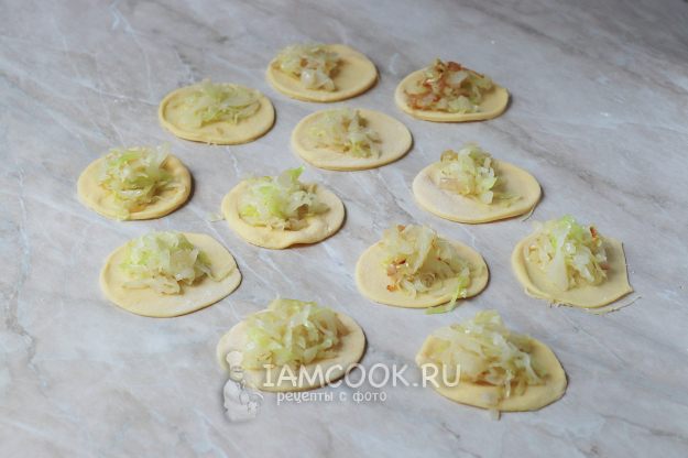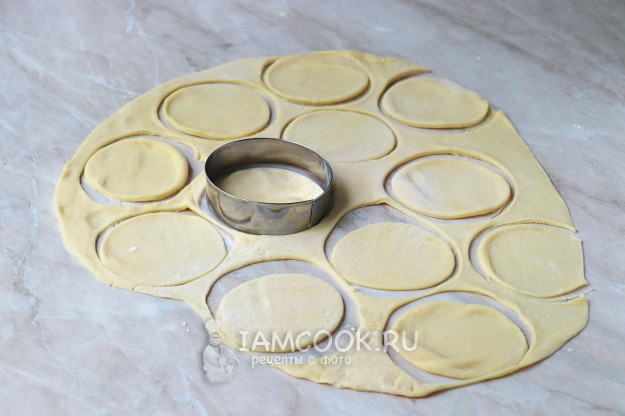 За это время тесто "отдохнуло" и сделалось более эластичным и податливым. Раскатайте его в тонкий пласт, выдавите круглой формой (стаканом) кружочки. Они должны быть достаточно крупными, иначе трудно будет залепить начинку.