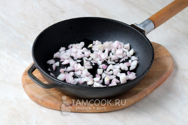 Подготовьте начинку: лук очистите и нарежьте небольшими кубиками. У меня он мелкий, поэтому использовала 4 шт. Если у вас крупный лук, то достаточно и одного. Выложите нарезку в сковороду с растительным маслом. Жарьте, периодически помешивая, до прозрачности.