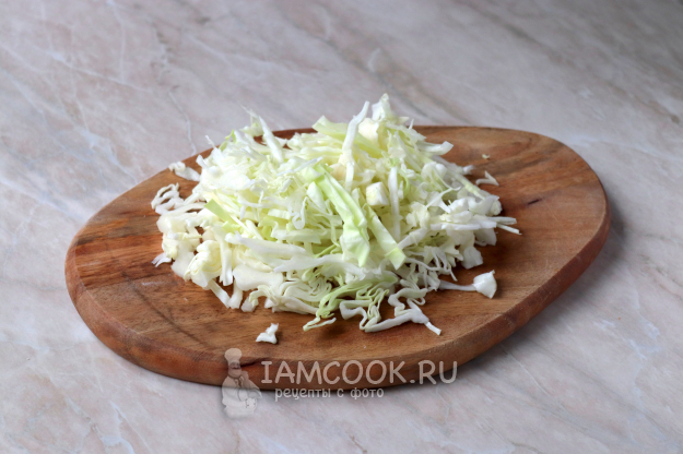 С кочана оборвите верхние листочки, они, как правило, всегда порченые. После чего капусту нашинкуйте тонкими длинными полосами.