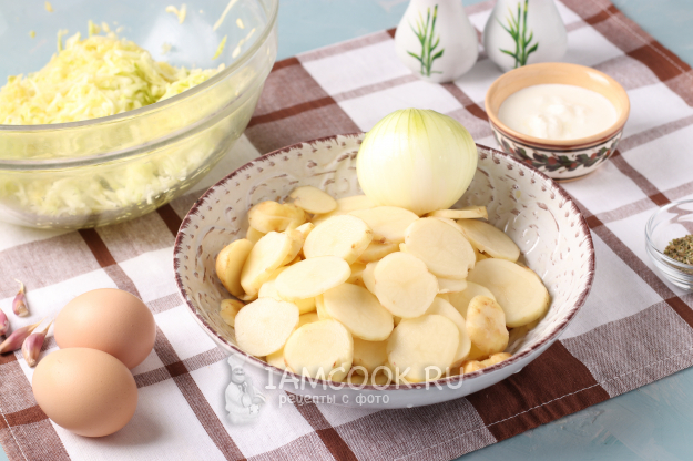 Картофель хорошо вымыть губкой для мытья посуды. Так же как и кабачки, картошку можно не чистить, если она ещё не обросла грубой кожурой. Нарезать картошку тонкими кружочками. Почистить лук.