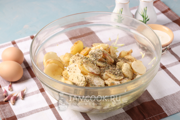 С кабачков слить лишнюю жидкость, можно слегка их отжать, но без фанатизма. Добавить к кабачкам нарезанный картофель. Посолить, добавить перец и базилик, аккуратно перемешать.