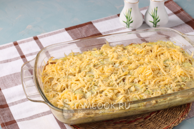 Готовить запеканку в разогретой до 180 градусов духовке 35-40 минут. Затем достать, посыпать тёртым сыром и запекать ещё 5-7 минут, пока не расплавится сыр.