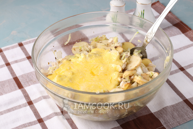 Филе с луком и чесноком добавить в общую массу. Яйца взбить со сметаной и тоже добавить в полученную массу, хорошо перемешать.