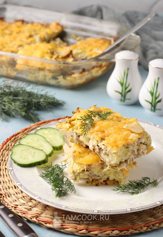 Запеканка из кабачков с курицей и картошкой готова. Немного остудите её, а дальше можно нарезать кусочками и подавать к столу с зеленью и овощами.