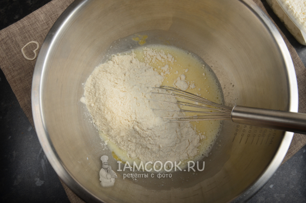 Начните добавлять в миску понемногу пшеничную муку и размешивать венчиком. Бросьте также щепотку соли.
