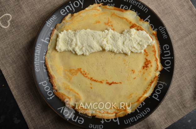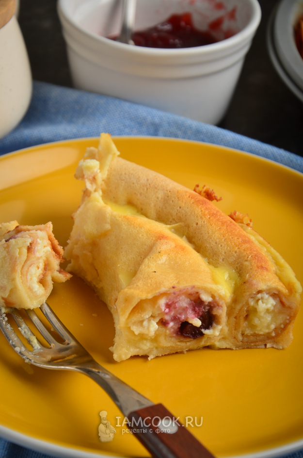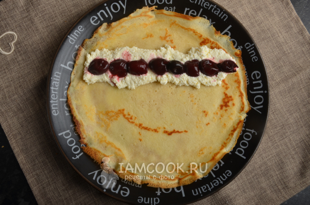 На полоску из творога выложите вишню без косточки. Сверните блинчик в плотный рулет.