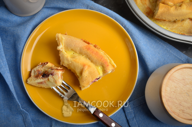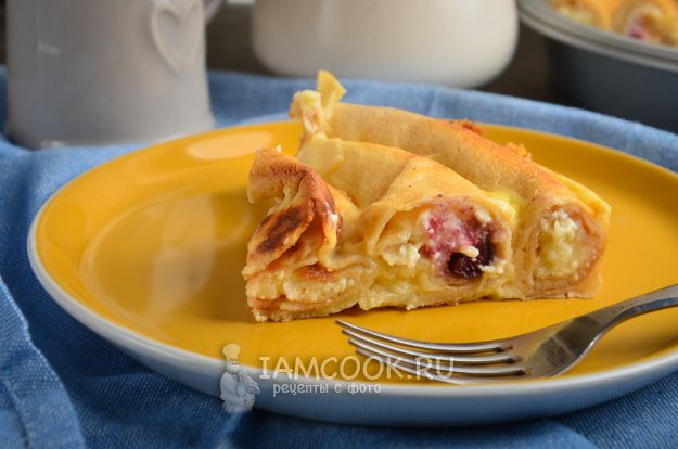 Залейте блинчики в форме заливкой, поставьте в разогретую до 170 градусов духовку. Выпекайте блинный пирог с творогом и вишней минут 20.