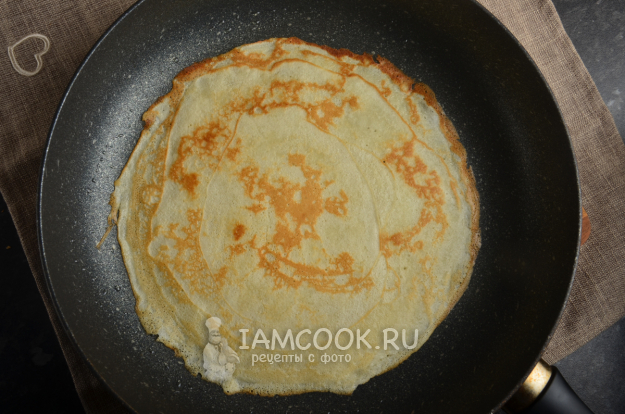 На смазанную маслом разогретую сковороду вылейте небольшое количество теста, жарьте блинчик пару минут, после переверните на другую сторону и жарьте еще минуту. После снимите его со сковороды и жарьте следующий.