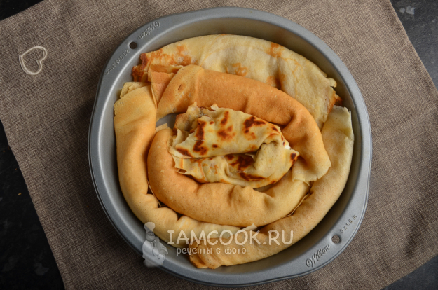 Выкладывайте блинчики с творогом и вишней в круглую форму.
