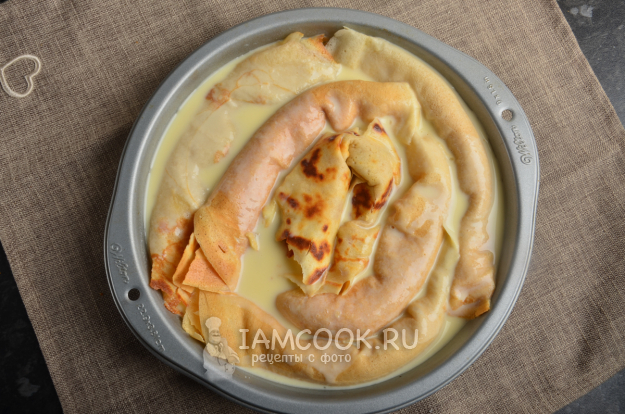 Сделайте заливку из молока, оставшейся сметаны и куриного яйца. Добавьте ложку сахара и все размешайте.