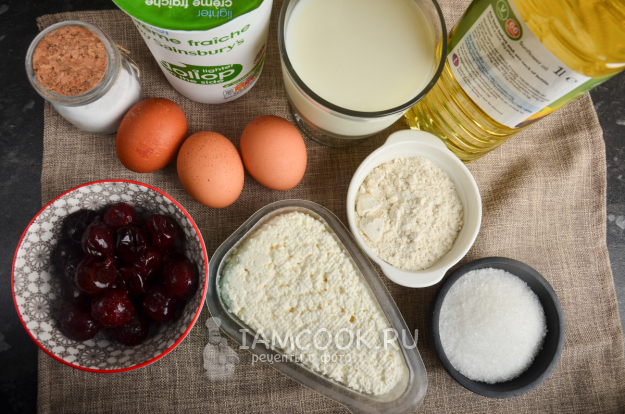 Подготовьте все необходимые продукты для блинного пирога с творогом и вишней. Отмерьте нужное количество молока, сахара, муки, творога.