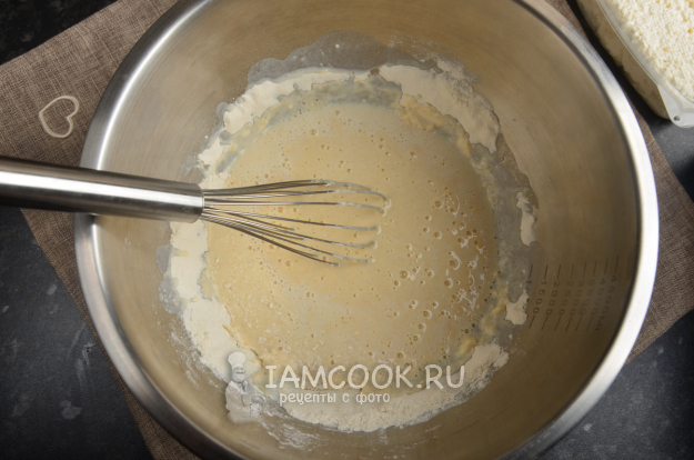 Добавьте в миску всю муку, размешайте и влейте молоко (250 мл). Продолжайте размешивать.