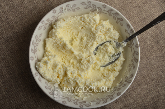 В миску переложите творог, добавьте сметану (2 ст.л.) и сахар (2 ст.л.), начните перемешивать.