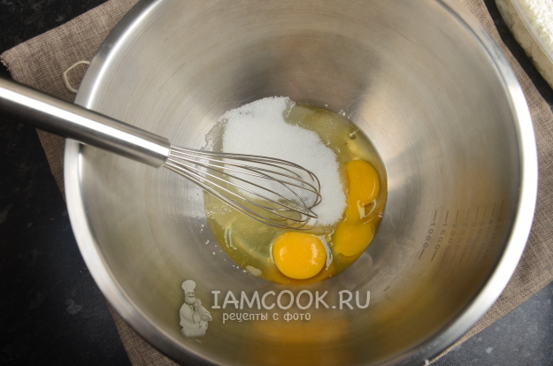 В миску вбейте пару куриных яиц, добавьте 2 ст.л. сахара.