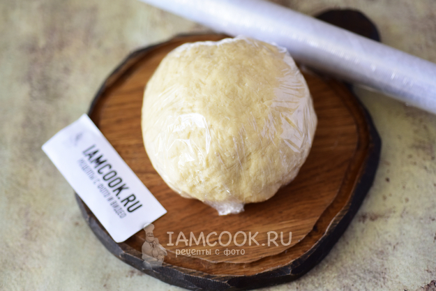 Замесить тесто сначала ложкой, затем руками. Оно должно получиться достаточно плотным, не прилипающим к рукам. Обернуть всю массу теста в пищевую пленку и положить на 10-15 минут в морозильную камеру - это придаст мягкость и эластичность при раскатке.