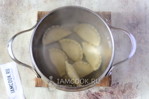 В кастрюлю залить такое количество воды, чтобы партия вареников смогла свободно плавать. Довести воду до кипения на среднем огне. Выложить в кипяток партию вареников и варить 3 минуты после всплытия.