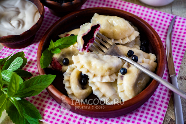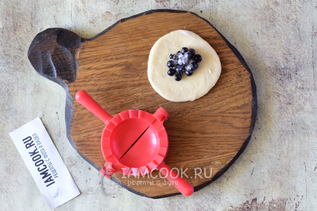 От охлажденного теста, предварительно сняв пищевую пленку, отщипывать небольшие кусочки (примерно 30 г). Раскатать каждый такой кусочек скалкой в кружок толщиной 2-3 мм. На середину выложить чайную ложку черники, присыпать сахаром по вкусу. Чтобы заготовки вареников получились аккуратными и одного размера, я использую для защипывания краев специальное устройство, но можно это сделать и пальцами, имея определенную сноровку.