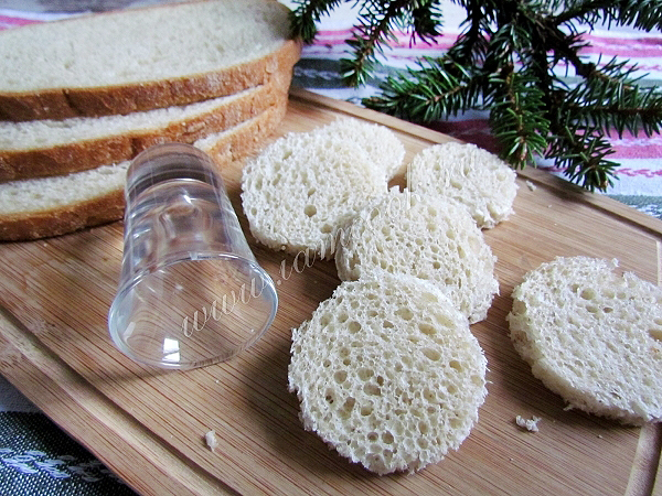 С помощью горлышка стакана или рюмки из мякиша хлеба сделайте основу для мини-бутербродов.