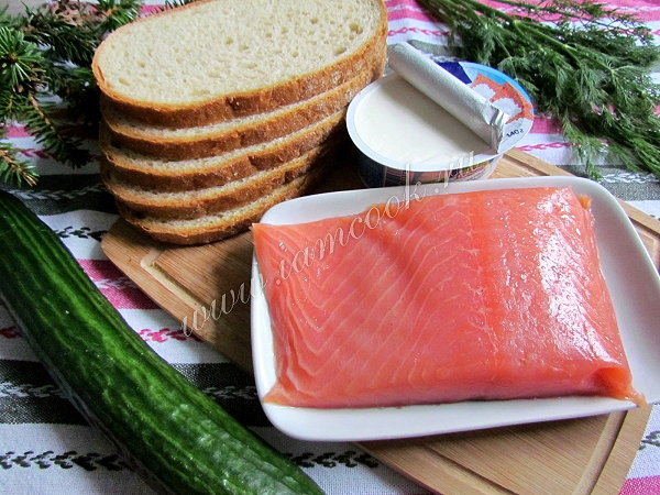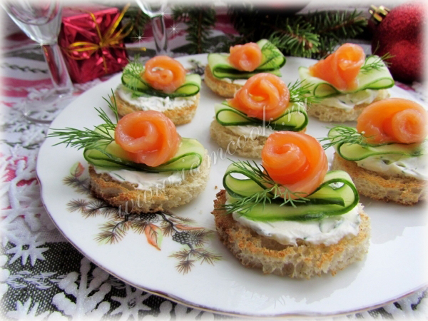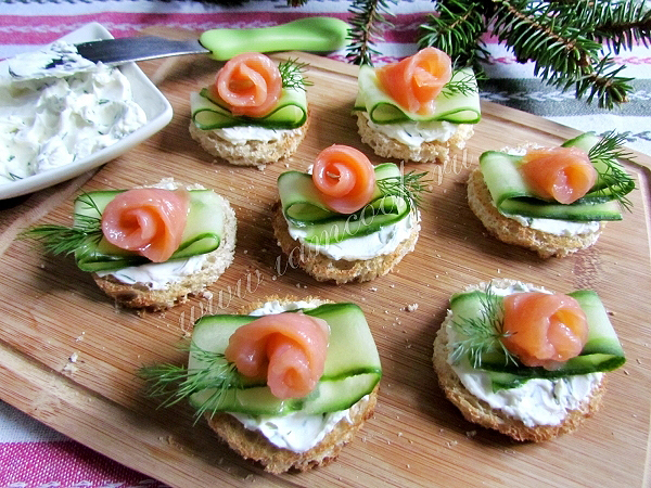 Положите по одному огуречному ломтику на тост с начинкой. Форель нарежьте тонкими длинными полосками и заверните каждую в виде розочки. Положите сверху огурца. Украсьте свежим укропом.