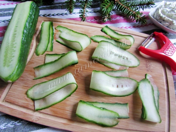 Огурцы вымойте, просушите бумажной салфеткой и с помощью овощерезки или острого ножа аккуратно нарежьте тонкими продольными полосками.