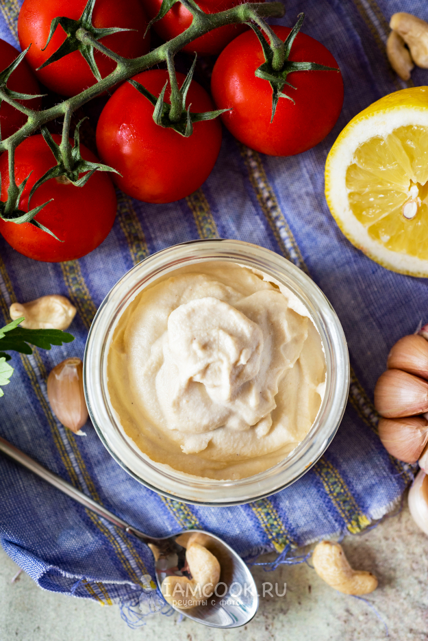 Готовый веганский майонез из кешью выложить в стеклянную баночку. Подавать можно сразу к любимому блюду, а можно поставить на полку холодильника для хранения (не более одной недели).