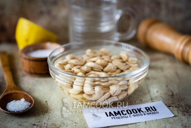 Кешью залить горячей водой (не кипятком) на 30 минут, затем слить воду.