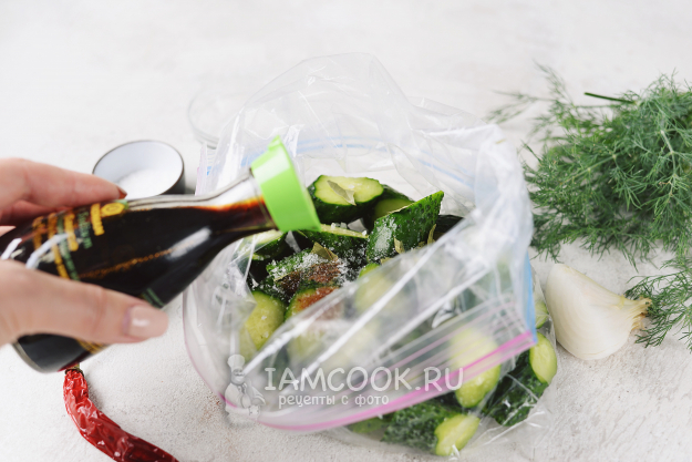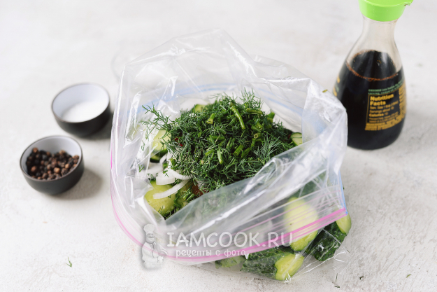 Сложите огурцы в пакет на застежке, всыпьте соль, сахар и оба вида перца, влейте соевый соус.