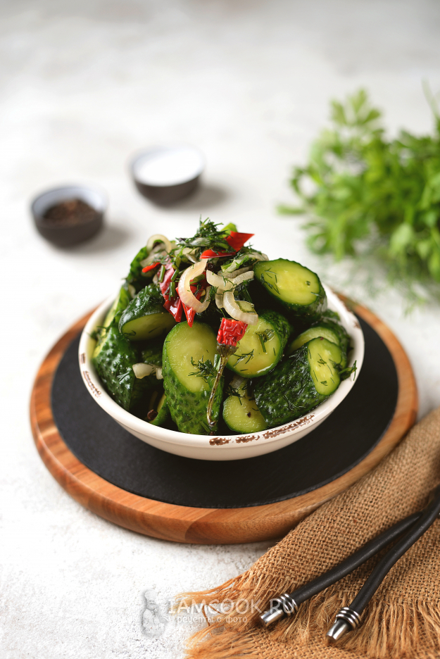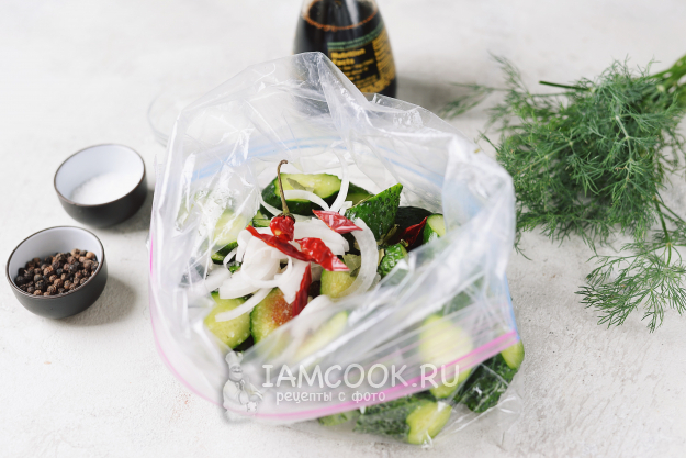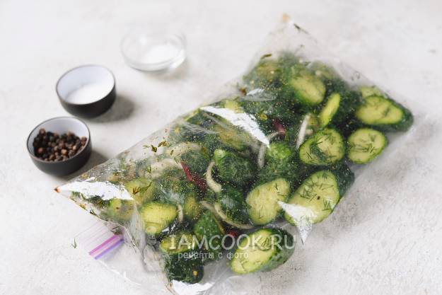 Закройте пакет, хорошенько его встряхните. Оставьте при комнатной температуре на 2 часа. Время от времени встряхивайте пакет, чтобы огурцы солились равномерно.