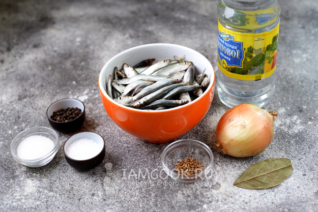 Возьмите необходимые продукты для приготовления маринованной кильки в домашних условиях. Кильку аккуратно промойте под проточной водой. Лук почистите от шелухи, также помойте.