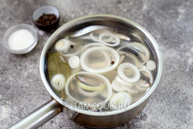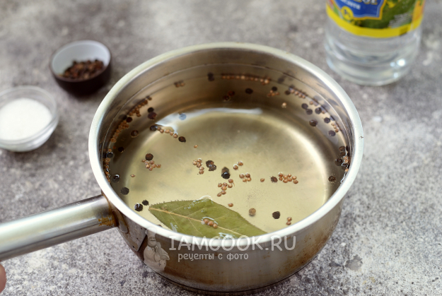 Влейте в сотейник воду, всыпьте соль и сахар, добавьте лавр, кориандр и перец горошком.