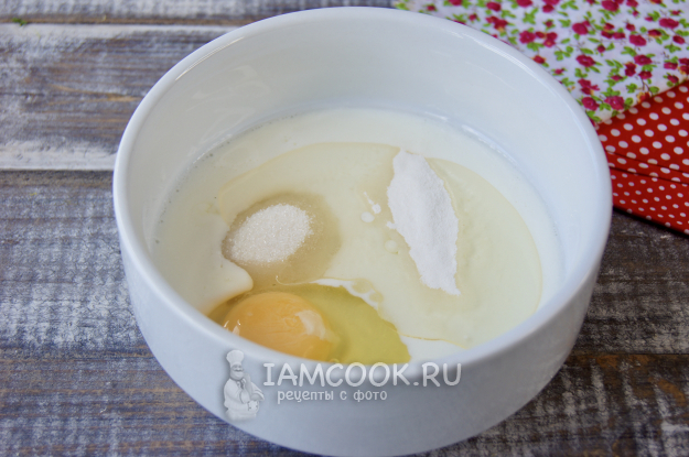 Влейте растительное масло без яркого запаха, лучше рафинированное, добавьте сахар, соль, разрыхлитель и перемешайте при помощи венчика. Масса слегка начнет пузыриться, так и должно быть.