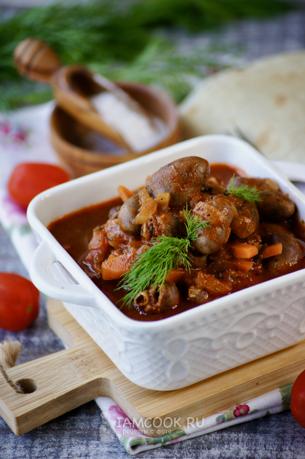 Вкусные, нежные тушеные куриные сердечки в томатном соусе готовы.