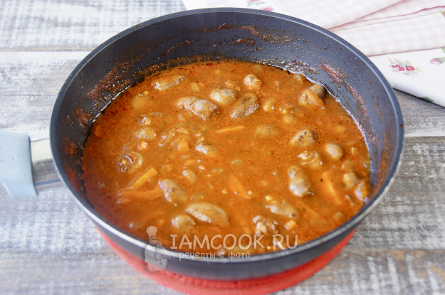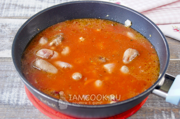 Залейте томатным соусом сердечки, доведите до кипения, убавьте огонь на минимальный, накройте крышкой и тушите около 50 минут.