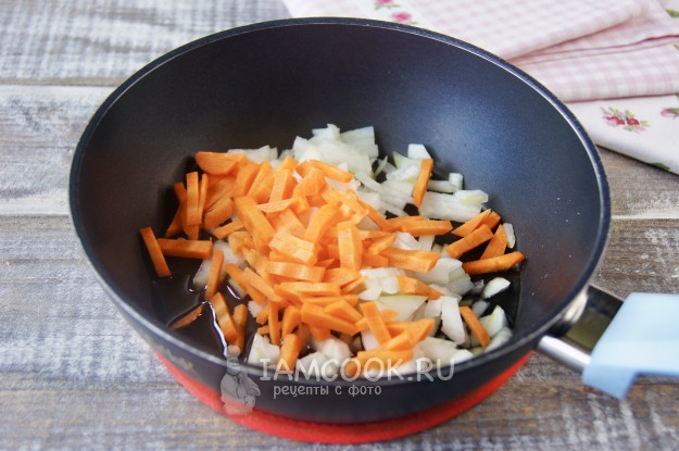 Для начала очистите овощи. Лук мелко нарежьте, морковь нарежьте либо натрите на крупной или мелкой терке - это уже по вашему усмотрению. Разогрейте сковороду с растительным маслом, выложите овощи и, помешивая, обжарьте на среднем огне до мягкости.