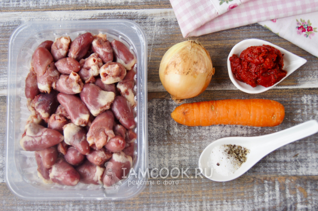 Возьмите все необходимые продукты для приготовления куриных сердечек в томатном соусе на сковороде.