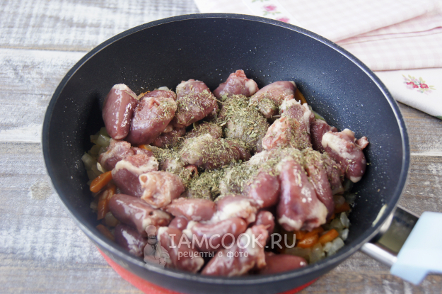 Куриные сердечки промойте, по желанию срежьте лишний жир и выбросьте. Выложите сердечки в сковороду, добавьте сушеную зелень, соль и перец, обжарьте около 1 минуты, при этом помешивайте.