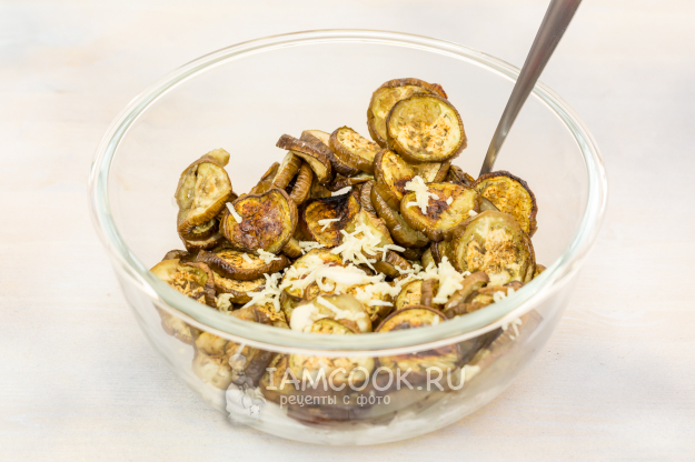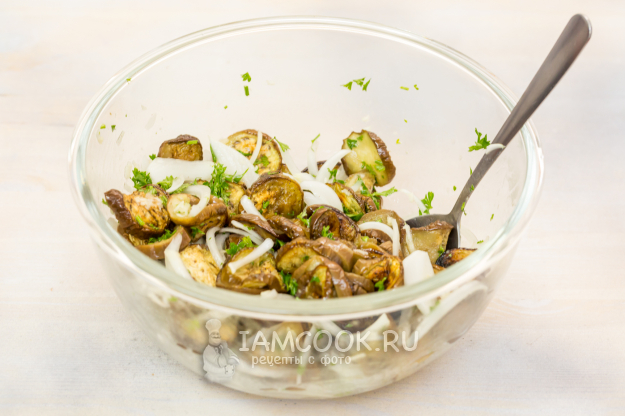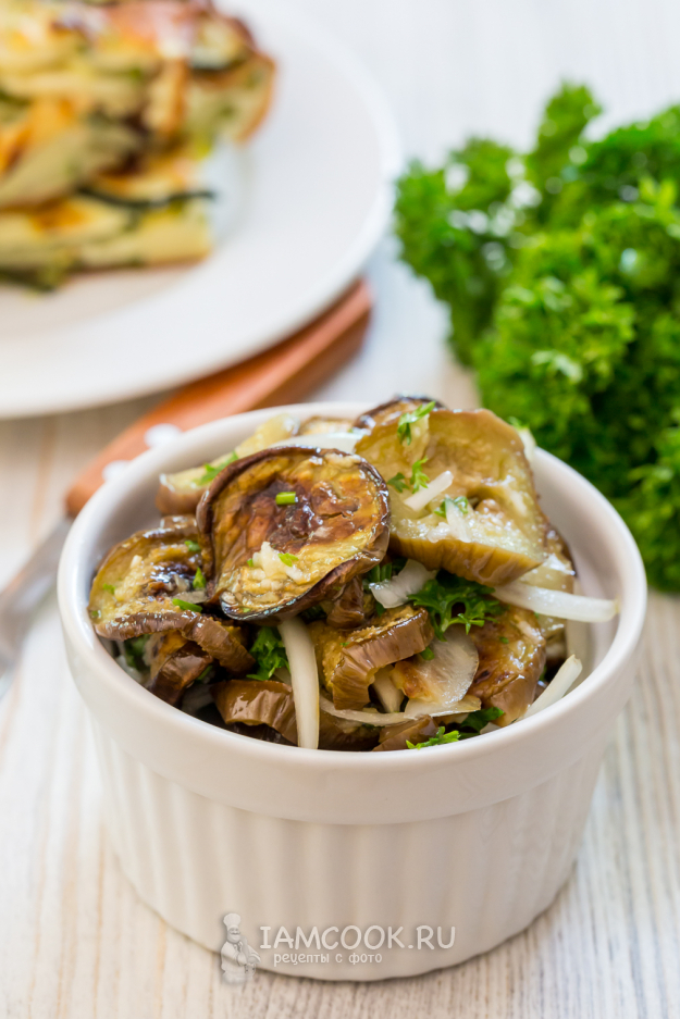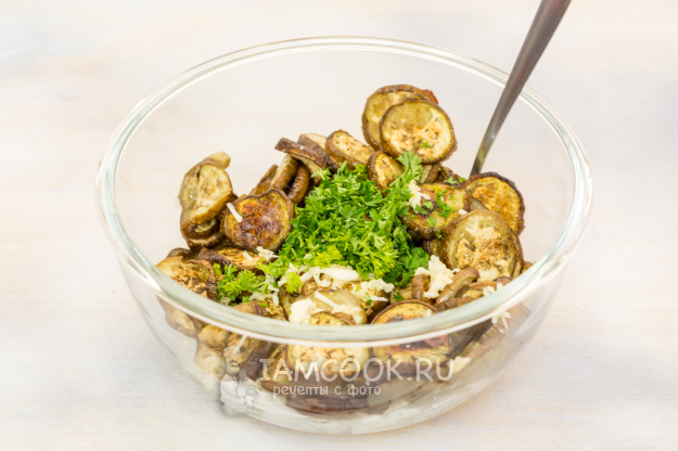 Еще очень теплыми добавьте в смесь лука и уксуса баклажаны. Туда же отправьте натертый на мелкой терке чеснок, остальное масло.